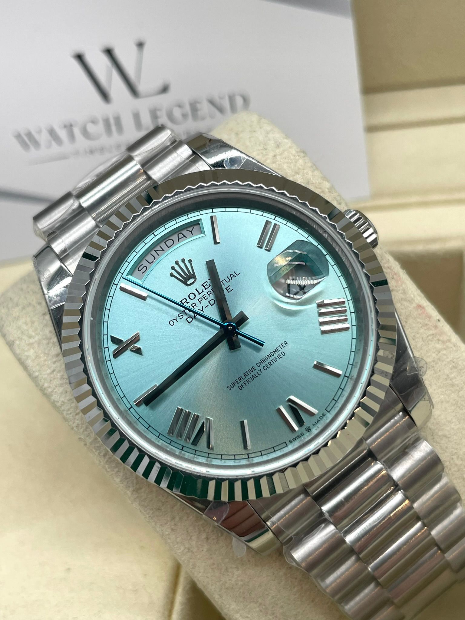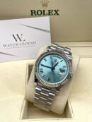 Rolex Day-Date Ice Blue Roman Platina Dial White Gold Bezel 40MM BP